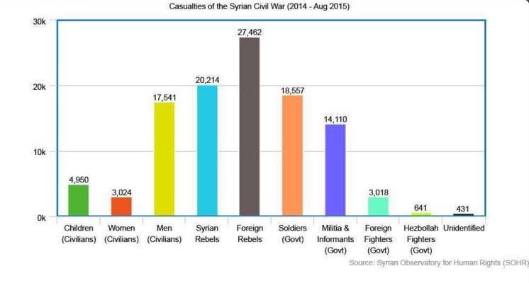 The war in Syria is intense and bloody. The death toll is huge. The Syrian Observatory for Human Rights, which supports the opposition, recently produced a graph showing casualties over the past year and half. As can been seen, the largest number of fatalities are foreign fighters. Why is this called a “civil war”?