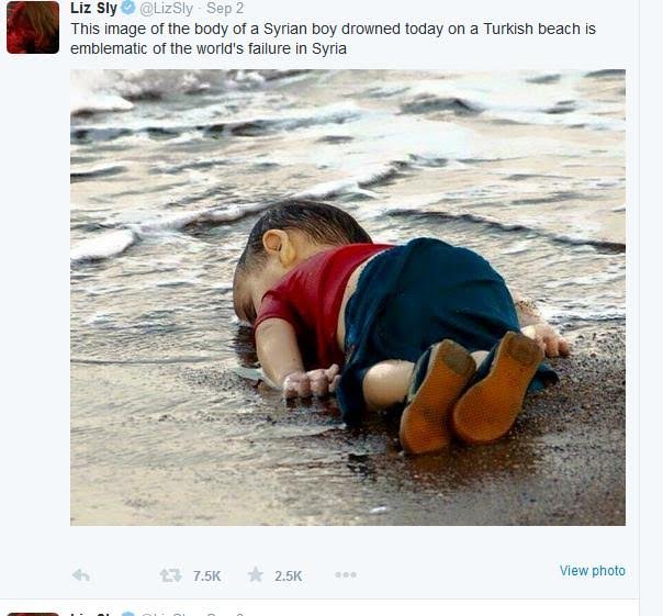 In a few hours it was published online and ‘went viral’ on Turkish then English language social media. Washington Post Beirut chief Liz Sly posted the photo with comment that Aylan’s death is “emblematic of world’s failure in Syria”. Minutes later, Nadim Houry of Human Rights Watch (HRW) posted the photo with comment that it’s an “indictment of collective failure”.