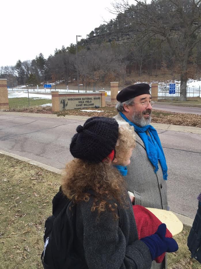 Camp Douglas, WI — On February 23rd, two peace activists with Voices for Creative Nonviolence, Brian Terrell and Kathy Kelly, were arrested when they attempted to deliver a loaf of bread and a letter to drone operators at Volk Field, an Air National Guard Base in Wisconsin, which trains pilots to operate Shadow Drones over other countries. Voices activists have lived alongside ordinary people in Afghanistan, Pakistan, Iraq and Gaza. People who can’t flee from drone surveillance and attacks have good reason to fear people from the U.S., but instead they have broken bread with Kelly and Terrell and have welcomed opportunities for deepened mutual understanding. Kelly and Terrell carried the loaf of bread to signify the worth of relying on words rather than weapons.