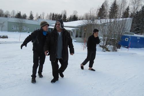 The author, Mohammad and Omar at a Finnish camp for asylum seekers, January 2016 (Photo by Hakim)