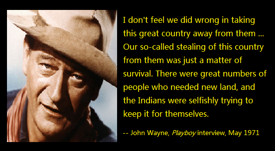 John Wayne, of course, is the quintessential American hero. The cowboy hero who killed the outlaw and the Indian, saved the settlers, and won the wars. Donald Trump is the ideal capitalist, the deal-maker, the success story that the huddled masses yearn to imitate. What could be more awe inspiring and patriotic that the coming together of these two icons of the American dream. The problem comes when we look for any foundational truths beneath these mythic figures.