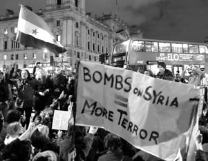 Nov. 28, 2015. In London hundreds of demonstrators gathered outside Downing Street, where the Prime Minister has offices, to denounce the British government’s decision to continue bombing Syria. Photo: Alisdare Hickson on Flickr