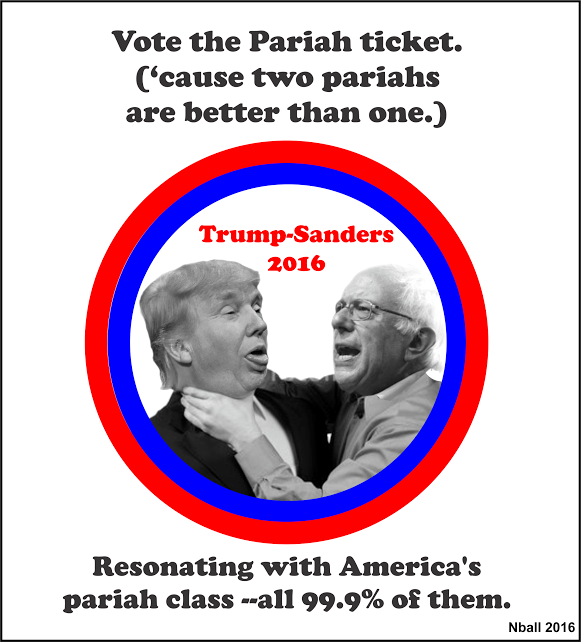 A Trump-Sanders administration would turn the political class on its head, maybe for good. Combined, their side-by-side groundswells would gather up 99.9% of the clear-headed. Overnight, everything would stop making sense. The same old venerable bullshit would lose its preferential station at the trough. Anything that discombobulates the entrenched buys room for the People. More dada please.