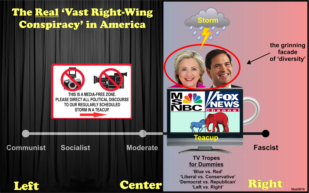 Let that sink in Fox-heads. Sanders is a right-winger on any spectrum worth its calibration. Of course, Americans know this isn’t true because TV has taken great pains to tell them otherwise: Sanders is a socialist way over there (pan far-left). Trump is a fascist way over there (pan far-right). In truth, you could spit the distance between Sanders and Trump or even Cruz. So why all the social media do-or-dieness? American politics is a jammed-together intramural bitch-fest trying to pass itself off as a thought-provoking panoply of diverse opinion. It behooves the establishment to keep up fractious appearances. However no one lands a real punch, the babes are distractively hot and change can’t get a changing room. Teacup, meet storm.