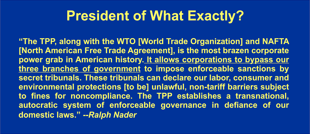 In a post-TPP world, the same forces that captured government in the first place would finish the job by making the Presidency perfunctory and answerable to multinational bodies. Clinton, Cruz, Rubio and Kasich are body-snatched globalists who’ll need a shoehorn to fit into national office. Their empire patrons are on-board for WW3. Trump and Sanders, refreshingly retro-50’s, show an abiding interest in American stuff that’s almost quaint in its nostalgia. Whereas right out of the gate, all the rest have an unacknowledged—and fundamentally deceptive—conflict of venue.