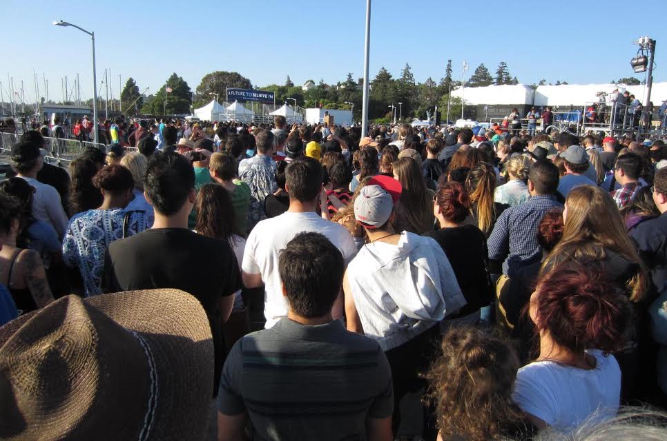 The gathering was held in a huge grassy area alongside the water estuary. The area was enclosed with security fencing so that audience members all had to pass through metal detectors. One and half hours before Sanders’ speech, the line to go through the security screening was half a mile long. Yet spirits were high with a buzz in the air.