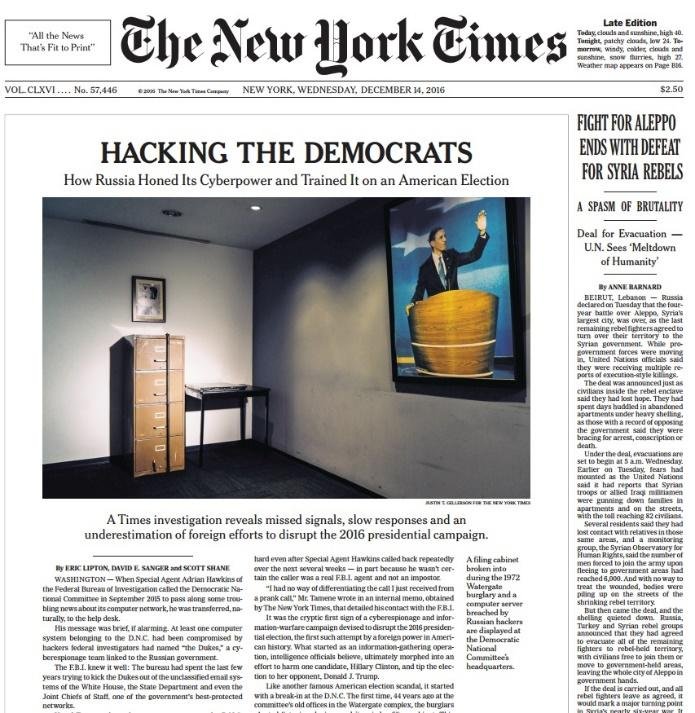 “Experts point out…”, “Specialists agree…”, “There is a consensus among intelligence agencies …” While the plot’s been cooking for several months now, it was the DNC leaks and Hillary Clinton’s subsequent defeat against Donald Trump what finally put the ‘serious’ press, mainly the Washington Post and the New York Times, working in its propagandistic role: ‘the Russians are trying to destroy American democracy’, they say.