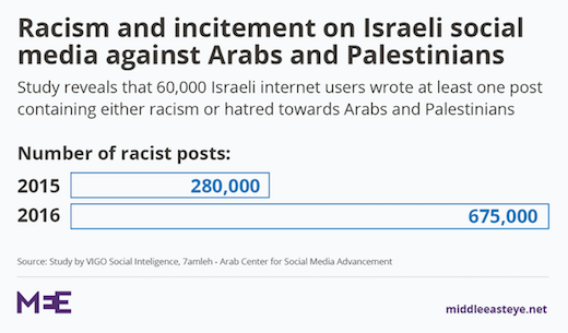 “There are terrifying levels of hate speech online from Israeli Jews,” Nadim Nashef, 7amleh’s director, told MEE. “No one in Israel – politicians, the police, the courts and the social media companies – has shown any interest in doing something about it.