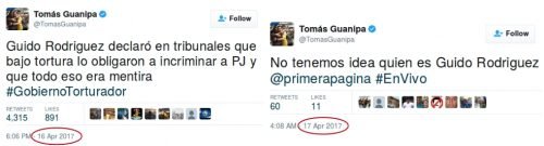 Reaction from Primero Justicia Secretary General Tomás Guanipa: the left tweet from April 16 says “Guido Rodriguez swore in court that he was forced under torture to incriminate PJ and that it was all a lie”, and the right one from April 17 says “We have no idea who Guido Rodriguez is”.