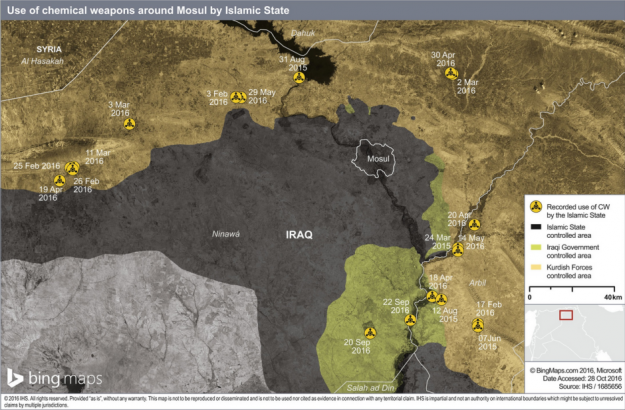ISIS has repeatedly used chemical agents in Mosul. In November 2016, Britain-based HIS Conflict Monitor reported that since 2014 to November 2016, the Islamic State conducted at least 52 chemical attacks.