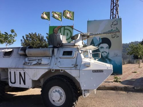 UNIFIL vehicle parked in front of Hezollah poster