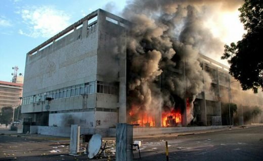 The Housing Ministry in Maracaibo was set alight on May 24th. The Housing Mission (Gran Misión Vivienda Venezuela) has delivered 1.6M houses to poor and working class families (photo from Alba Ciudad)