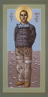 Mark Scibilla Carver and Jack Gilroy had driven to Chicago from Upstate NY, carrying with them a life size icon bearing an image of Salmon, standing alone in what appeared to be desert sands, wearing a prison-issue uniform that bore his official prison number. Next to the icon was a tall, bare, wooden cross. Rev. Bernie Survil, who organized the vigil at Salmon’s grave, implanted a vigil candle in the ground next to the icon. Salmon’s grand-niece had come from Moab, Utah, to represent the Salmon family. Facing our group, she said that her family deeply admired Salmon’s refusal to cooperate with war. She acknowledged that he had been imprisoned, threatened with execution, sent for a psychiatric evaluation, sentenced to 25 years in prison, a sentence which was eventually commuted, and unable to return to his home in Denver for fear of being killed by antagonists. Charlotte Mates expressed her own determination to try and follow in his footsteps, believing we all have a personal responsibility not to cooperate with wars.