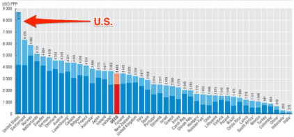 [Dark blue is public spending and light blue is private spending. The red bar is the average.]