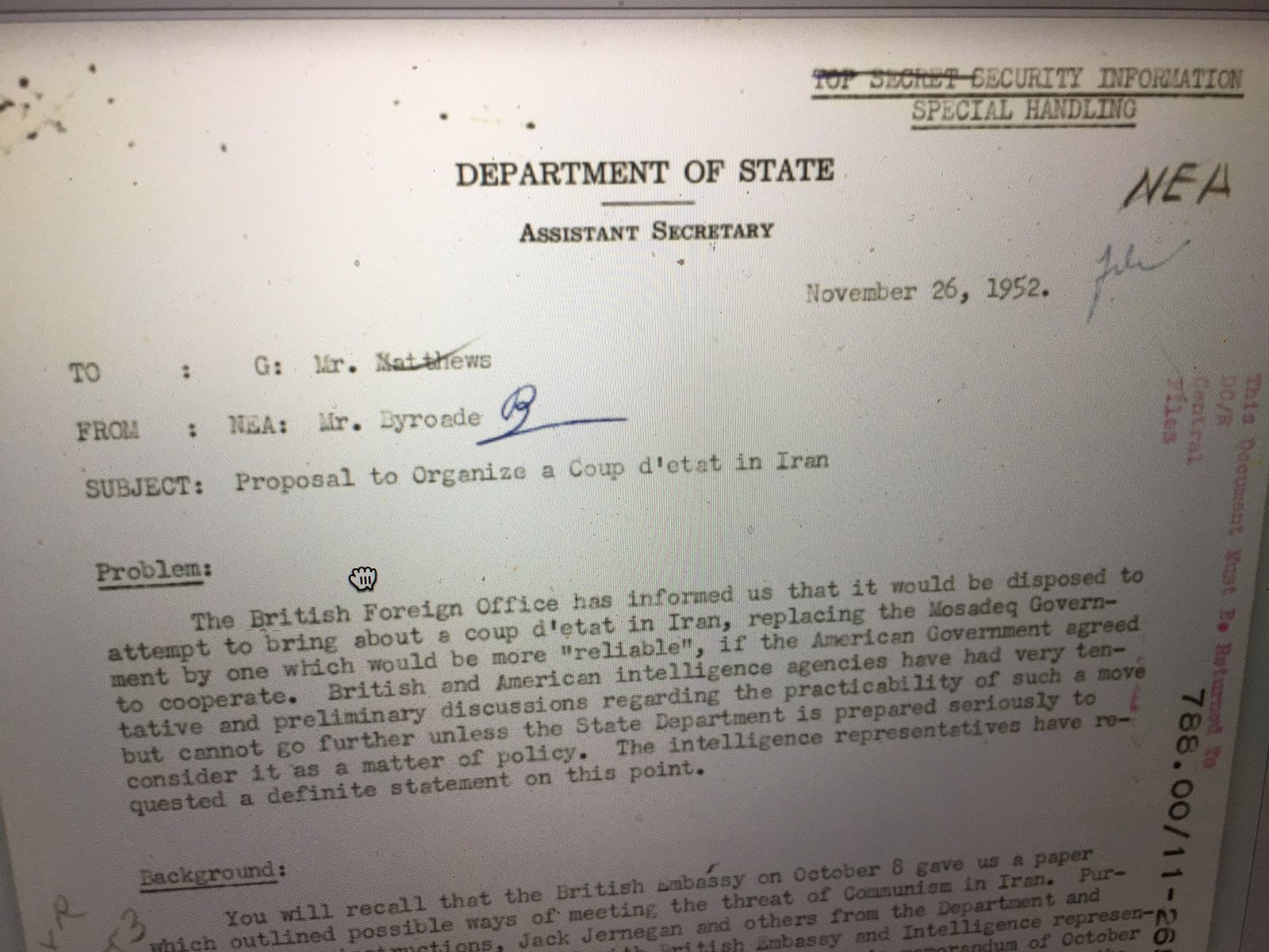 The military coup that overthrew Mosaddeq and his National Front cabinet was carried out under CIA direction as an act of US foreign policy, conceived and approved at the highest levels of government,” reads a previously excised section of an internal CIA history titled The Battle for Iran.