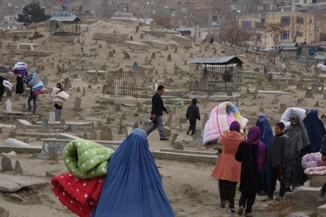 Bearing quilted bedcovers Afghans walk through the cemetery to their mountainside homes