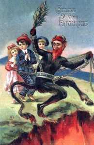The predominant figure of Christmas has become Santa Claus (Dutch: Sinter Klaas) and originated in the stories around St Nicholas, the 4th century Bishop of Myra (Turkey), giving anonymous gifts to help people in need or trouble. ((Nicholas: The Epic Journey from Saint to Santa Claus, by Jeremy Seal, p. 28.)) In many European regions St Nicholas came door to door with a bishop’s mitre and crosier on his feast day, December 6. He was accompanied by his helper Ruprecht or Krampus as he is known in the Alpine regions. Krampus is depicted as half goat and half demon and punished misbehaving children with a rod.