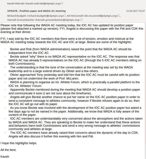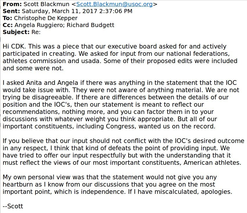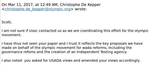 That correspondence was in reference to the statement from the US Olympic Committee, circulated on March 10, 2017 by the leading global news agencies, that it was preparing some kind of “position paper” in advance of the March 11-12 World Anti-Doping Agency Symposium in Lausanne (Switzerland), which would include American proposals for reforming WADA, specifically stipulating that “there must also be a clearly independent anti-doping body with overriding global authority of those national anti-doping organization (NADO) programs, with the responsibility to test, investigate, and sanction when necessary – ensuring consistency across countries and sports.” This was undoubtedly an attempt by the US to head off the initiative announced by de Kepper in his February 23 memo about needing reform and better balance from WADA. De Kepper’s urgent email to Blackmun leaves no doubt that the USOC statement was entirely unexpected for him:
