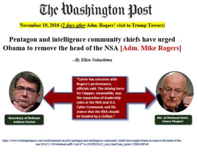 A mere two days after the latter’s November 17 2017 trip to Trump Towers where it is strongly presumed he tips the cards to Trump regarding the building’s bugged status, Secretary of Defense Ash Carter and Director of National Intelligence James Clapper are baying in the Washington Post for Rogers’ firing (see below). One of the pressing reasons given? Rogers’ ‘gruff personality’. The day after Rogers’ visit, Trump relocates his entire transition operation to Bedminster, New Jersey.