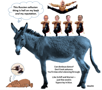 Cementing the Democratic brand of Russian collusion even further, we shouldn’t forget Senator Mark Warner’s (D-Va.) attempts to make secret off-the-record communications with Christopher Steele in November 2017. Warner’s intermediary was the same lobbyist (Adam Waldman) retained by, are you ready? Oleg Deripaska. Heehaw!