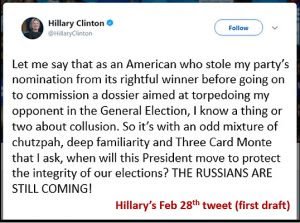 In a recent tweet, Hillary Clinton stoops yet again to Russia-baiting. Then there’s the thirteen Facebook trolls who happen to be Russian nationals engaged in a strictly business venture with no evidence of a state actor role and no overt political leanings. None of this prevents Deputy Attorney General Rod Rosenstein from alluding by sly inference to the Russians during his press conference (here at 3:19) as though King Bee Putin himself was supplying the company with kitty and puppy clickbait pics from the depths of the Kremlin’s basement.