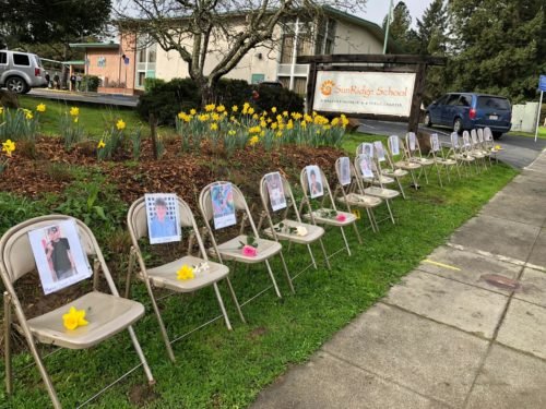 The Sunridge 8th grade class (Sebastopol) arranged this memorial in front of their school before heading down to Main Street to participate in a 17 minute moment of Silence. (Photo: Bill Shortridge)