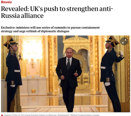 But today’s Guardian’s “exclusive” story “Revealed: UK’s push to strengthen anti-Russia alliance” is doing none of this. Nothing the powerful would want hidden from us is being “revealed”. No one had to seek out classified documents or speak to a whistleblower to bring us this “revelation”. Everyone in this story – the journalist Patrick Wintour, an anonymous “Whitehall official”, and the named politicians and think-tank wonks – is safely in the same self-congratulatory club, promoting a barely veiled government policy: to renew the Cold War against Russia.