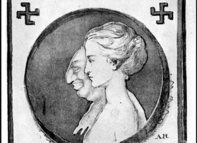 In the end, and admittedly under some pressure from me for clarification, she offered an illustration of why she thought the cartoon was “kind of anti-semitic”. She sent a link to the image below, stating that she thought Hanitzsch’s cartoon of Netanyahu had echoes of this Nazi image of “the Jew” alongside an Aryan German woman.