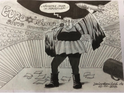 In fact, the cartoonist is far from alone in highlighting such concerns. The New York Times has reported delight among Israelis at the prospect of what they regard as a “diplomatic victory” as much as musical one. And, according to the Haaretz newspaper, the Eurovision contest organisers have already expressed concern to Israeli broadcasters about likely attempts by Israel to “politicise” the competition.