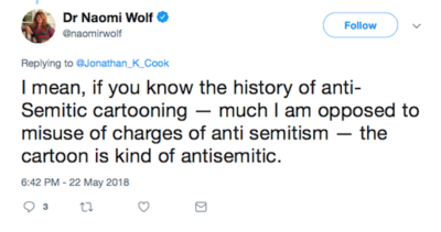 Among those responding on Twitter to my post was Naomi Wolf, a US Jewish intellectual and feminist scholar whose body of work I admire. She disagreed with my blog post, arguing that the cartoon was, in her words, “kind of anti-semitic”.
