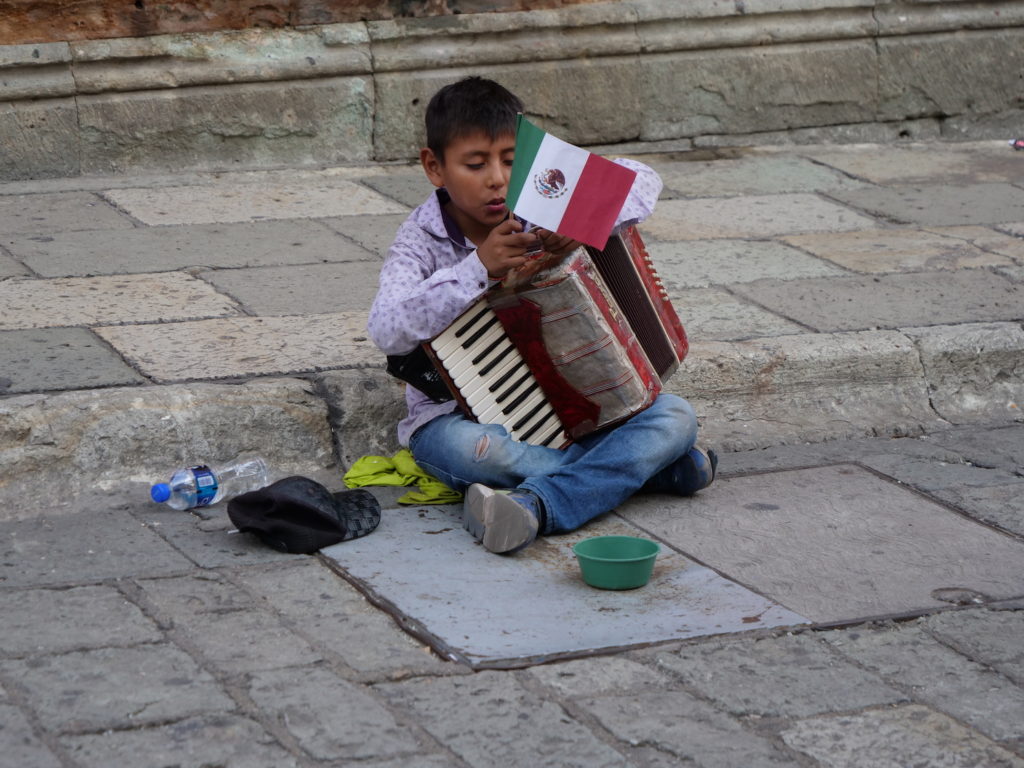 At night, live bands are playing old ballads, all over the city center. People are dancing, drinking and promenading. But displaced men, women and children living in the tents are brutal reminder of real Mexico, of true suffering of many poor and almost all native people.