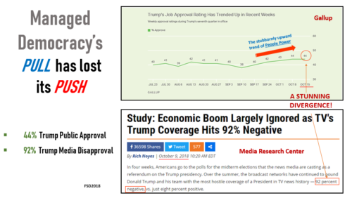 Managed Democracy has little choice but to ignore the booming economy and satisfy itself with telegenic pratfalls, such as how Trump occasionally walks in front of his wife and sets umbrellas down without closing them. To America’s great credit, the CNN snarks are losing big-time. Trump’s job approval keeps rising despite the relentless whingeing. Even a 92% media negativity onslaught can’t avert the upward ascent of Trump’s numbers (see the Media Research Center and recent Gallup numbers, below).