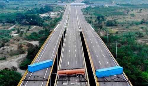 The first trucks carrying the so called humanitarian aid for Venezuela have arrived at the Colombian border city of Cúcuta where a standoff is taking place after the Venezuelan government closed the border and blocked the highway with shipping containers and a fuel truck.