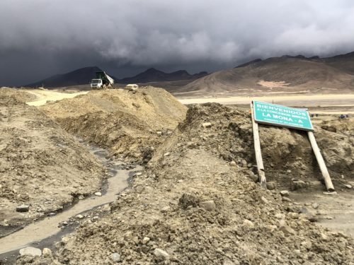 The piles of garbage appear. Behind them, two tremendous mountains covered by snow. And an ironic metal sign: Welcome to La Rinconada”, “Do not litter.”
