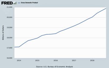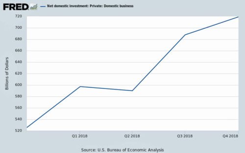 According to Department of the Treasury reports, corporate tax receipts fell by 28 percent – from $223 billion in 2017 to $162 billion during the first nine months of fiscal year 2018. For that reason, as the following chart shows, the Federal Government deficit, which has increased in all of years of Trump’s presidency, increased by $114 billion. If $75b taxes had not been collected on the $500b of repatriated profits, the deficit would have increased by $189b. Because the defict increased, it can be argued that the deficit increase, caused by the tax cuts, stimulated the economy.