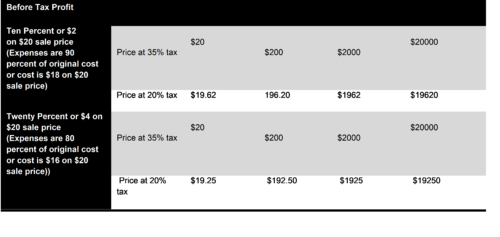 Another supposition is that, with increased after tax profits, corporations can improve competition from foreign sources by trading the profits for lower prices. How much can prices be lowered? Calculations, shown in the following table, demonstrate what products will cost for two different profit margins with reduction of the corporate tax from 35 percent to 20 percent, and if the corporation forfeited all of the profit increase by reducing its prices.