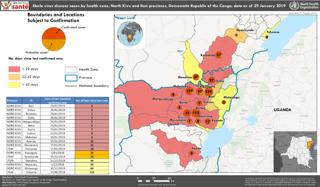 Recently Dr. Richard Valery Mouzoko Kiboung, head of the Ebola team in Butembo, a Camerounais working for WHO, was attacked and killed at a medical conference; two of his staff were wounded. The killers’ motivation is unknown. Some local groups say that Ebola doesn’t exist and its threat is used as a means of control, or money raising. ((“The Doctor Killed In Friday’s Ebola Attack Was Dedicated — But Also Afraid,” Nurith Aizenman, April 23, 2019, npr: Goats and Soda.))