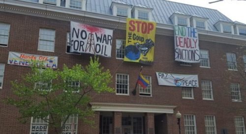 While the final four inside members of the Embassy Protection Collective were arrested on May 16, 2019 (and released the next day), the Collective’s efforts to protect the Venezuelan Embassy in Washington, DC and to end the US coup continue.