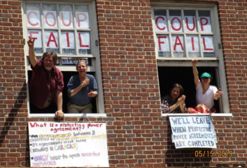 The Embassy Protectors arrested inside and outside will continue to defend themselves in court. The next hearing of the four inside Embassy Protectors has been moved to this Friday, May 31 at 9:30 am before the chief judge of the US District Court in Washington, DC, Judge Beryl A. Howell. Ironically, as we were serving as interim embassy protectors with the permission of the democratically-elected Venezuelan government, the four were charged with violation of 18 U.S. Code §”118. “Interference with certain protective functions.” Anyone who followed the activities during the Embassy Protection Collective’s actions can see the State Department was failing to protect the embassy as it allowed pro-coup advocates to break windows and doors, break and enter into the building, deface the building and assault people outside the building while threatening those inside the building.