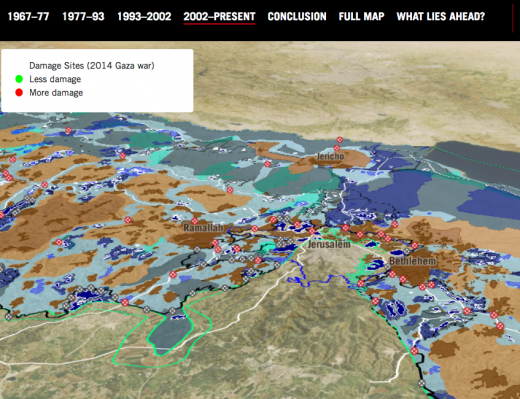That point is underscored by an innovative interactive map of the occupied territories. This valuable new resource is a joint project of the Israeli human rights group B’Tselem and Forensic Architecture, a London-based team that uses new technology to visualise and map political violence and environmental destruction.