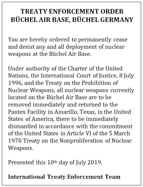 BÜCHEL, Germany — Eleven international peace activists entered the Büchel Air Base southwest of Frankfurt early this morning to deliver what they called a “Treaty Enforcement Order” declaring that the sharing of US nuclear weapons at the base is a “criminal conspiracy to commit war crimes.”