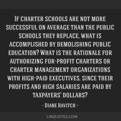 Whether we are talking about cyber charter schools or brick-and-mortar charter schools, for-profit or non-profit charter schools, “good” charter schools or “bad” charter schools, “high-performing” versus “low-performing” charter schools, independent charter schools or charter schools run directly by big business, ((These are usually known as CMOs (Charter Management Organizations) and EMOs (Education Management Organizations).)) the fact remains that the different forms and types of charter schools cannot conceal their core essence as privatized arrangements that annually funnel billions of public dollars to narrow private interests.