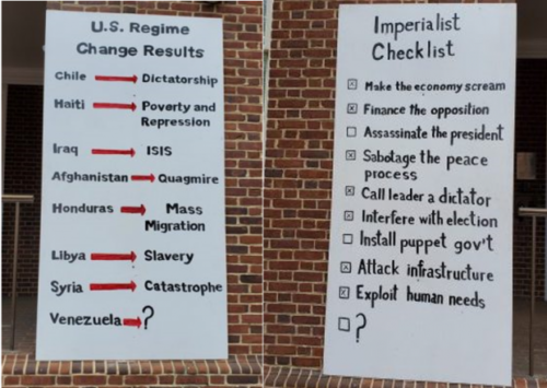 Two placards placed outside the Venezuelan embassy by the Embassy Protectors Collective (From Popular Resistance)