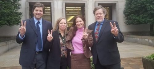 Embassy protectors [left to right: David Paul, Margaret Flowers, Adrienne Pine, Kevin Zeese] outside of court on February 13, 2020, by Martha Allen.