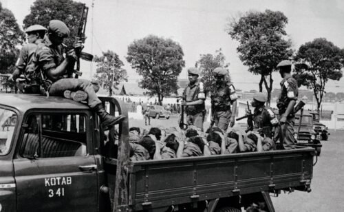 Armed police transporting suspected members of a communist youth group, Jakarta, Indonesia, October 10, 1965. Photo Credit: Vincent Bevins)