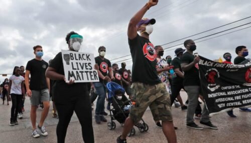 Protesters march in a Black Lives Matter demonstration organized by the Dallas Black Firefighters Association on Juneteenth 2020 in Dallas (AP Photo/LM Otero)