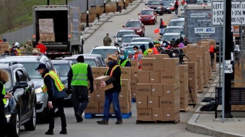 Boxes of food are distributed by the Greater Pittsburgh Community Food Bank, at a drive thru distribution in downtown Pittsburgh, 10 April, 2020 (AP Photo/Gene J. Puskar.)
