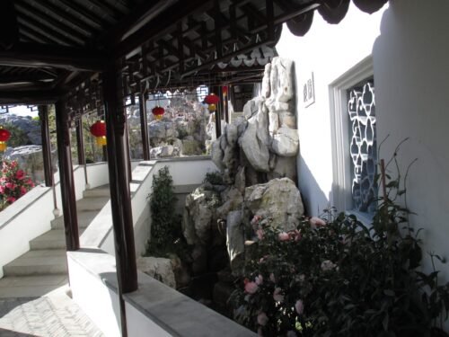 Chinese scholar gardens are, in effect, three-dimensional Chinese landscape paintings. The Chinese scholar garden in Portland, which I have not yet been able to visit, has the “Knowing the Fish Pavilion.” “Knowing the fish” is a direct reference to Zhuangzi. The photo below, taken at the Chinese scholar garden in Dunedin, New Zealand, depicts the same idea as Yuan Yao’s painting. The corridor was constructed in such a way as to avoid interfering with the rocks and bushes.
