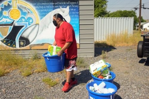 Jason Umtuch carries supplies during a mutual aid drop-off to the Warm Springs community. Lukwaiya (Mitchell Lira).