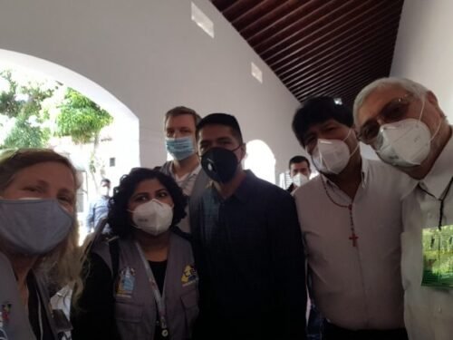 Evo Morales and Andronico Rodriguez, the current Senate President in Bolivia, visit a voting center in Caracas (Margaret Flowers)